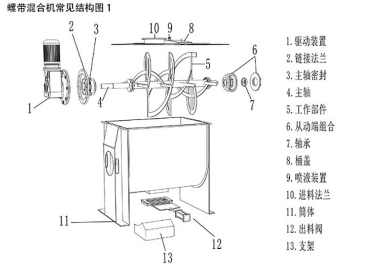 由U形容器、螺帶攪拌葉片和傳動(dòng)部件組成;U形的長(zhǎng)體筒體結(jié)構(gòu),保證了被混合物料(粉體、半流體)在筒體內(nèi)的小阻力運(yùn)動(dòng)。正反旋轉(zhuǎn)螺條安裝于同一水平軸上,形成一個(gè)低動(dòng)力高效的混合環(huán)境,螺帶狀葉片一般做成雙層或三層,外層螺旋將物料從兩側(cè)向中央?yún)R集,內(nèi)層螺旋將物料從中央向兩側(cè)輸送,可使物料在流動(dòng)中形成更多的渦流。加快了混合速度,提高混合均勻度;裝載系數(shù)大、設(shè)備占地面積小。